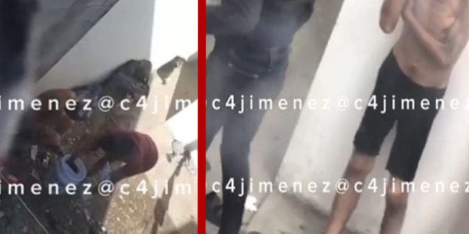 En las imágenes se aprecia que dicho detergente se lo avienta en la cabeza y con un recipiente le echa agua, la cual no se sabe si está caliente o fría, acto seguido el individuo sólo se le alcanza a ver que porta un short negro y en malas condiciones físicas.