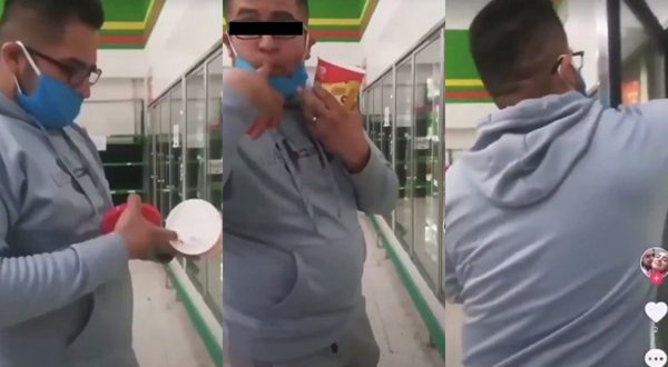Teniendo el cuidado de no ser descubierto, este sujeto presuntamente apodado “Chimpis”, destapa el bote que contenía el postre, mete uno de sus dedos, se lo lleva a la boca bajando el cubrebocas que portaba en su rostro y devuelve embace a su lugar en menos de un minuto según lo demuestra la grabación.