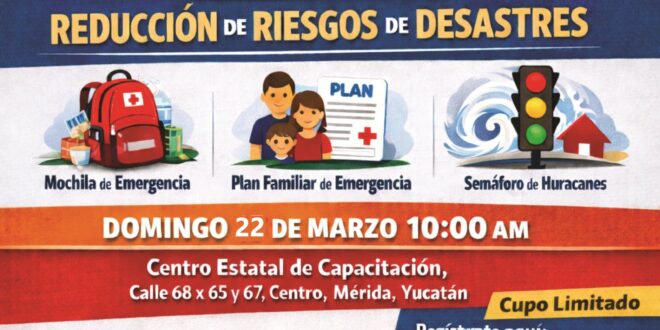 Mérida, Yucatán a 14 de enero de 2026.- La Cruz Roja Mexicana Delegación Yucatán hace una atenta invitación para asistir al taller de Reducción de Riesgos de Desastres para capacitarse sobre el semáforo de huracanes, la mochila y el plan familiar de emergencia. El Referente Estatal de Reducción de Riesgos …