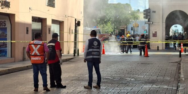 Mérida, Yucatán a lunes 9 de marzo de 2026.- Rápida respuesta dio el Ayuntamiento de Mérida ante un corto circuito de registro eléctrico en el Centro Histórico. Brigadistas de Protección Civil con apoyo de la Policía Municipal de Mérida acordonaron el cruce de la 62 con 61. Personal de prevención …