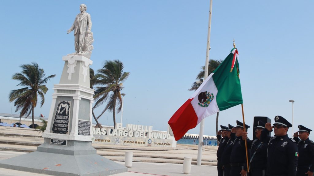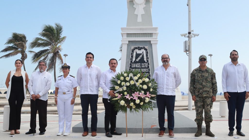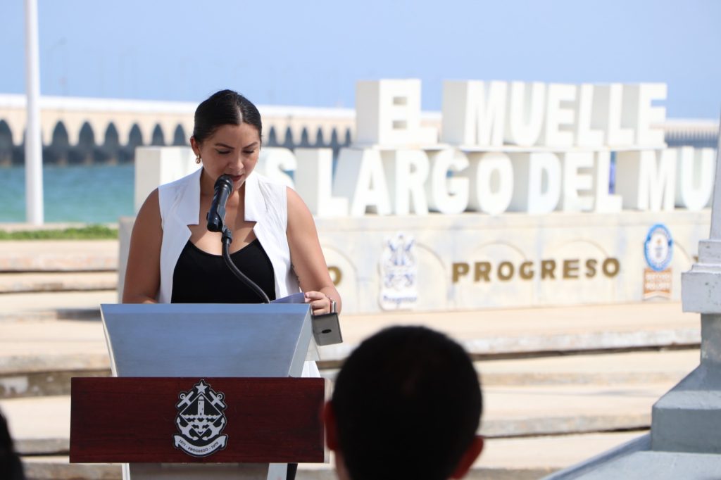 Frente a la estatua del fundador del puerto, Juan Miguel Castro Martín, la presidenta del Comité de los festejos del 153° aniversario de Progreso y regidora, Dulce María Soberanis Gamboa, invitó a los presentes a recordar los inicios del municipio, a celebrar su historia y continuar llevando en alto a Progreso en diferentes partes del mundo.