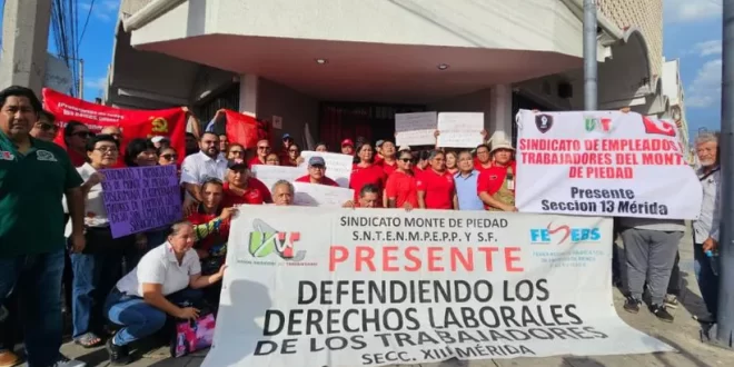 Los Trabajadores del Nacional Monte de Piedad (NMP) pertenecientes a la sección 13 del sindicato, iniciaron el paro el 1 de octubre de 2025; ayer se manifestaron a las puertas de la sucursal principal en Mérida, de esta empresa ubicada en la calle 69 esquina con 58, en el Centro Histórico de la ciudad, para reafirmar su postura ante el conflicto laboral que enfrentan y asegurar que no darán marcha atrás hasta que se cumpla lo establecido en el contrato colectivo de trabajo.