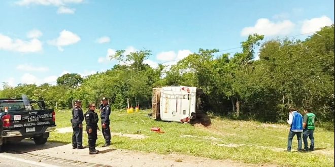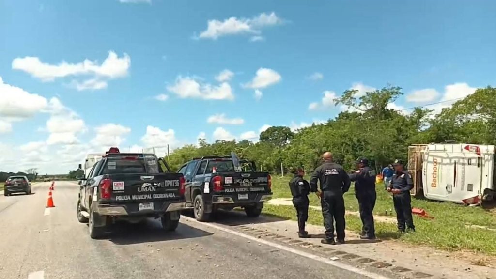 Hunucmá, Yuc., 18 de septiembre de 2025.- La tragedia rondó nuevamente la vía federal Mérida–Hunucmá, luego de que un camión de transporte de personal de la empresa “Bachoco” volcó esta mañana a la altura del kilómetro 147.