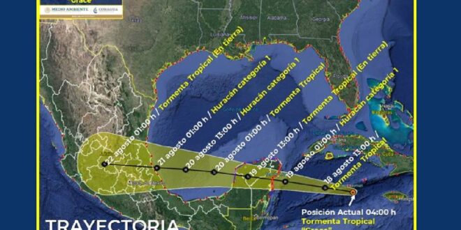 Este miércoles Grace se convirtió en huracán categoría 1 y se aproxima a la Península de Yucatán, pudiendo ingresar sobre las costas de Quintana Roo.