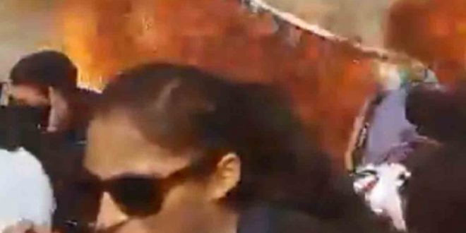 En un video difundido en redes sociales, se observa cómo la mujer vestida de negro avienta el petardo y posteriormente se retira del lugar.