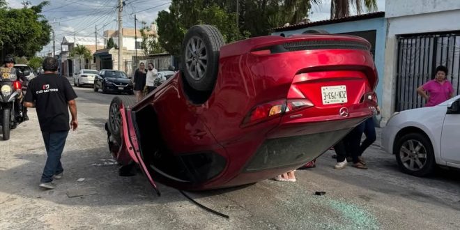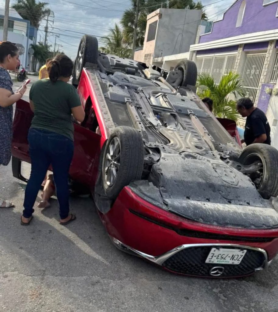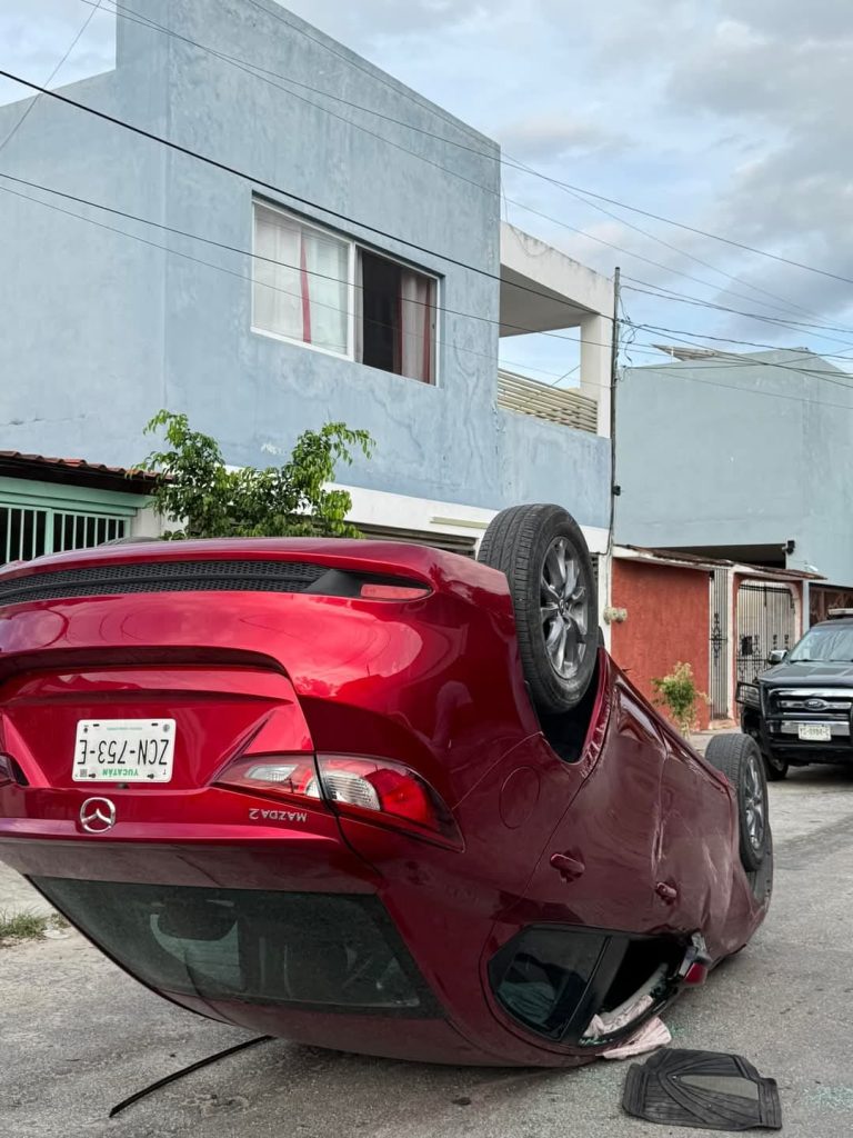 MÉRIDA, Yuc., 11 de febrero 2025.- Un aparatoso accidente ocurrió este lunes en la calle 33 #386 por 38 de la colonia Residencial del Norte, cuando un vehículo Mazda terminó volcado tras impactar a un automóvil estacionado. El hecho generó alarma entre los vecinos, quienes rápidamente salieron a auxiliar al conductor.