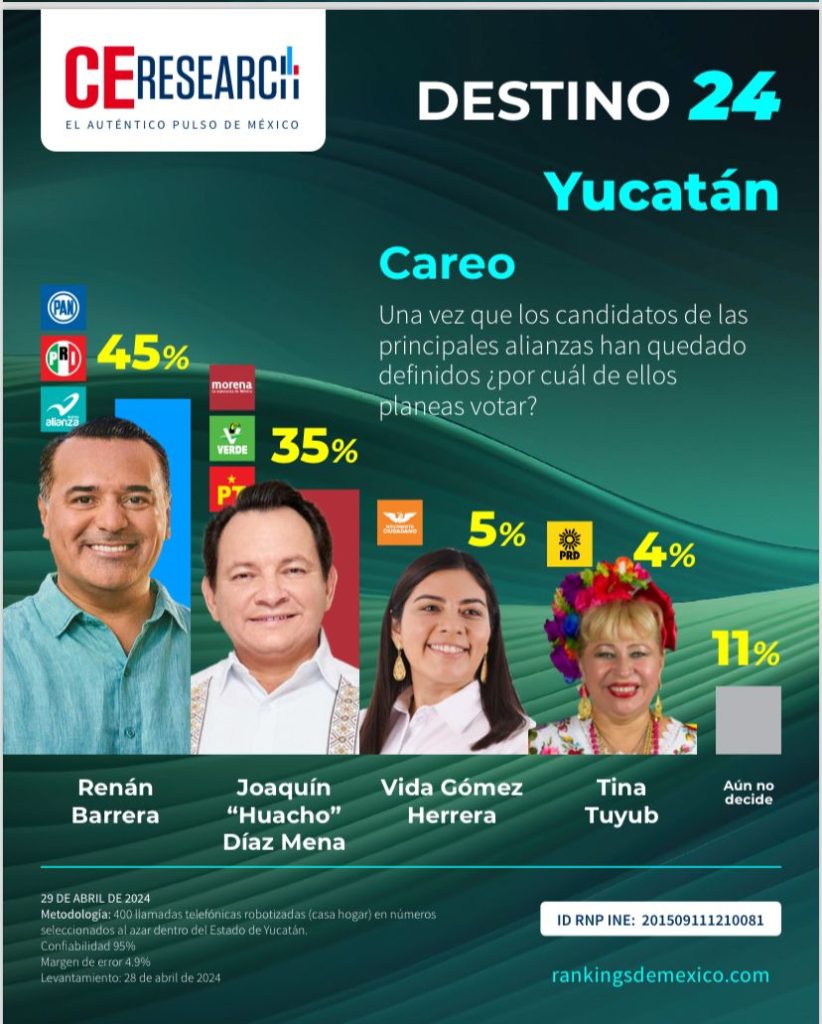 Mérida, Yucatán 29 Abril de 2024.- El candidato del Partido Acción Nacional (PAN) a la gubernatura de Yucatán, Renán Barrera Concha, mantiene su ventaja en las encuestas de cara a las elecciones del próximo 2 de junio, tal y como lo marca el último sondeo realizado por la casa encuestadora CE Research.