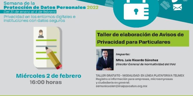 Mérida, Yucatán, 01 de febrero de 2022.- En el marco de la Semana Estatal de Protección de Datos Personales el Instituto Estatal de Transparencia, Acceso a la Información Pública y Protección de Datos Personales (Inaip Yucatán) llevará a cabo en colaboración con el Instituto Nacional de Transparencia, Acceso a la Información y Protección de Datos Personales (INAI) dos capacitaciones gratuitas para promover la elaboración de Avisos de Privacidad entre el empresariado Yucateco y el cuidado de los datos personales sensibles entre periodistas.