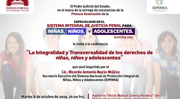 Mérida, Yucatán a 7 de octubre de 2019.- “La integralidad y transversalidad de los derechos de niñas, niños y adolescentes” se titula una conferencia que será impartida por el Secretario Ejecutivo del Sistema Nacional de Protección Integral de Niñas, Niños y Adolescentes (SIPINNA), Ricardo Antonio Bucio Mújica este martes 8 de octubre a las 16:00 horas en el Tribunal Superior de Justicia de Yucatán en esta ciudad.