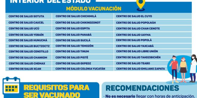 La dependencia estatal detalló que, se extenderá la vacunación en los Centros de Salud de Sotuta, Caucel, Ucu, Yobain, Hunucmá, Buctzoctz, Cenotillo, Chankom, Chemax, Xcan, Chichimilá, Chikindzonot, Espita, Panabá, Sucilá, Temozón, Tinum, Piste, Ekpedz, Colonia Yucatán, El Cuyo, Popolnah, Chan Cenote, Uayma, Popolá, Yaxcabá, Libre unión, Tahdzibichén, Teabo y Emiliano Zapata.