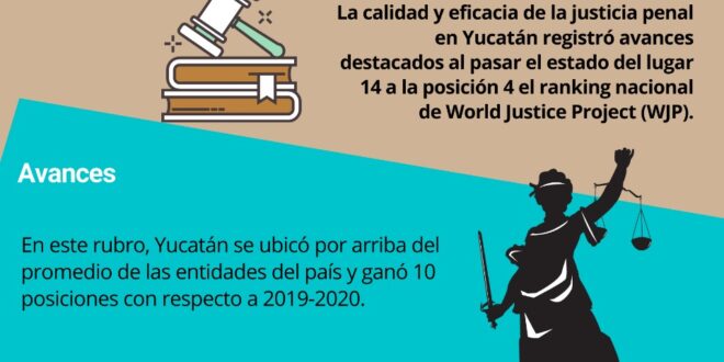 El Índice de Estado de Derecho en México 2020-2021 del World Justice Project (WJP) (Proyecto de Justicia Mundial), organización internacional independiente que trabaja para avanzar el Estado de Derecho en el mundo, la calidad y eficacia de la justicia penal en Yucatán registró avances destacados en plena pandemia, al pasar el estado del lugar 14 a la posición 4 en un solo año.