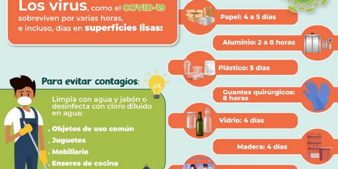 Los virus como el COVID-19 sobreviven por varias horas, e incluso días, en superficies lisas, por ejemplo: en el papel, de cuatro a cinco días; aluminio, de dos a ocho horas; plástico, cinco días; en los guantes quirúrgicos, ocho horas. En el vidrio y madera pueden sobrevivir cuatro días; mientras que en el acero, 48 horas.