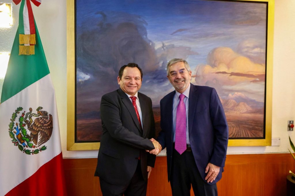 Durante el encuentro, llevado a cabo en las oficinas de la SRE en la Ciudad de México, Díaz Mena presentó el proyecto del Renacimiento Maya, una iniciativa clave para impulsar el desarrollo económico y cultural del estado. El Gobernador destacó el papel del Puerto de Progreso como un imán para la atracción de inversiones extranjeras, subrayando su importancia como motor económico para Yucatán.