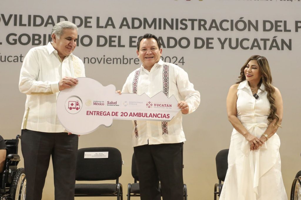 Mérida, Yucatán, a 21 de noviembre de 2024.- Los servicios de salud en Yucatán se fortalecen como resultado de las gestiones del Gobernador Joaquín Díaz Mena ante el Patrimonio de la Beneficencia Pública del Gobierno Federal, quien acompañado de la presidenta del Sistema para el Desarrollo Integral de la Familia (DIF) Yucatán, la maestra Wendy Méndez Naal, entregaron apoyos de movilidad a personas con alguna discapacidad y 20 ambulancias, destinadas a incrementar la capacidad de respuesta, preservar vidas y evitar daños graves o permanentes en la salud de la población yucateca.