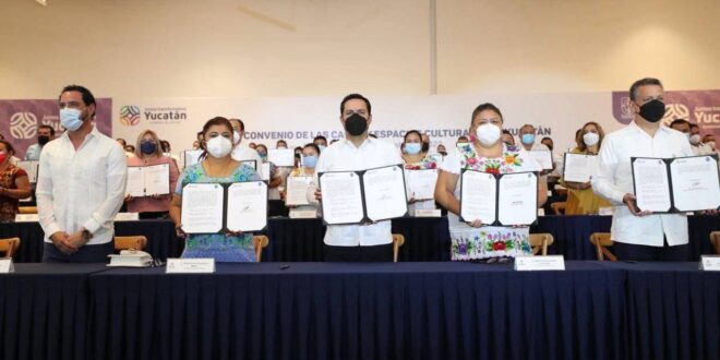 Mérida, Yucatán, 25 de abril de 2022.- Para acercar la cultura y las artes a cada rincón de Yucatán, el Gobernador Mauricio Vila Dosal y los 106 alcaldes del estado firmaron un convenio de colaboración para la reactivación e impulso de las casas y espacios culturales en todo el territorio, a través del programa Cultura para todos 2022, que permitirá llevar actividades culturales a niñas, niños y jóvenes, alejándolos de los malos hábitos y desarrollando sus talentos en las artes.