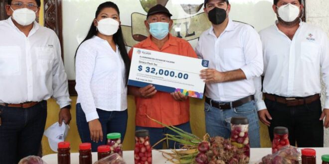 Ixil, Yucatán, 6 de mayo de 2022.- La ayuda que tanto esperaba José Felipe Chim Cocom para impulsar el cultivo de las cebollitas de Ixil en sus tierras, tras las afectaciones por el paso de huracanes y tormentas, llegó a sus manos al iniciar el Gobernador Mauricio Vila Dosal la entrega de apoyos económicos para el estímulo a la producción en beneficio de hombres y mujeres dedicados a la siembra de esta hortaliza que tanto identifica a esta población.