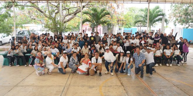 Flamboyanes, Progreso, Yucatán, 24 de junio de 2024. Estudiantes de la Escuela Telesecundaria Número 12 “Juan Miguel Castro” ubicada en Flamboyanes, Progreso participaron en la estrategia Paz a la Voz, que coordina la Secretaría de Educación del Gobierno del Estado, con la finalidad de acercar a los colectivos escolares, acciones que concienticen sobre la importancia de crear ambientes sanos en donde se promuevan las buenas acciones entre las y los estudiantes.