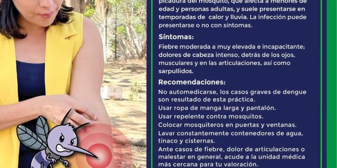 MÉRIDA, Yuc., 26 de agosto 2024.- En el marco del día Internacional contra el Dengue, el Instituto Mexicano del Seguro Social (IMSS) en Yucatán orienta sobre signos y síntomas de esta enfermedad viral, que se transmite por la picadura del mosco Aedes Aegypti, con el objetivo de reforzar y fortalecer la salud de todas y todos y así evitar cualquier complicación.