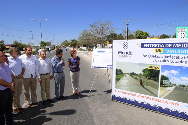 La Avenida Quetzalcóatl, puerta de entrada de miles de turistas que visitan Mérida y que ingresan por la carretera a Cancún, ya muestra un nuevo rostro: a lo largo de sus 5.7 kms ya rehabilitados, el Ayuntamiento de Mérida construyó 8 grandes pasos peatonales, mejoró la iluminación, los camellones, las banquetas y construyó nuevos pozos colectores de agua de lluvia.