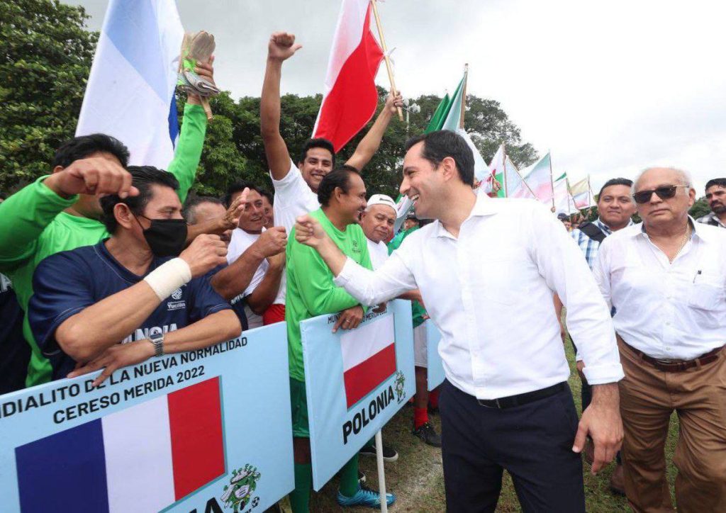 Mérida, Yucatán, 20 de noviembre de 2022.- El campo de fútbol del Centro de Reinserción Social (Cereso) de Mérida se llenó de emoción, colores y un gran ambiente por el arranque del Mundialito Cereso 2022, única fiesta futbolera que se realiza en un Centro de Reinserción Social en todo México como una réplica del Mundial Qatar 2022, al realizarse partidos en los que participan los internos de este lugar, evento que respalda el Gobernador Mauricio Vila Dosal, como parte de las acciones que impulsa para una buena reinserción social a través del fomento al deporte.