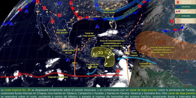 Se prevé que la onda tropical No.26 continúe su avance hacia el oeste, sin embargo, su influencia mantendrá nublados dispersos, con probabilidad de chubascos con tormentas localmente fuertes principalmente en el centro y suroeste de Campeche, oriente y noreste de Yucatán y el sur de Quintana Roo, así como chubascos