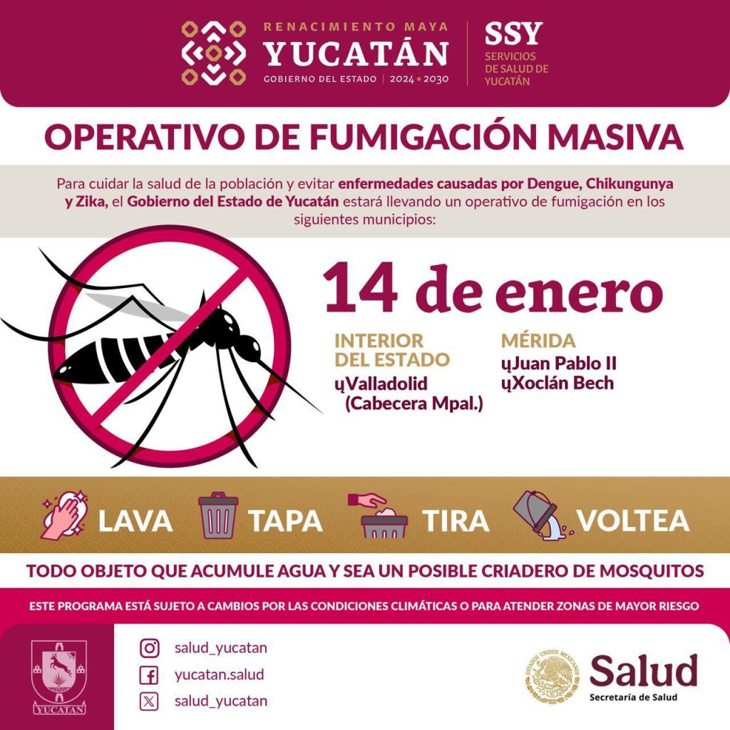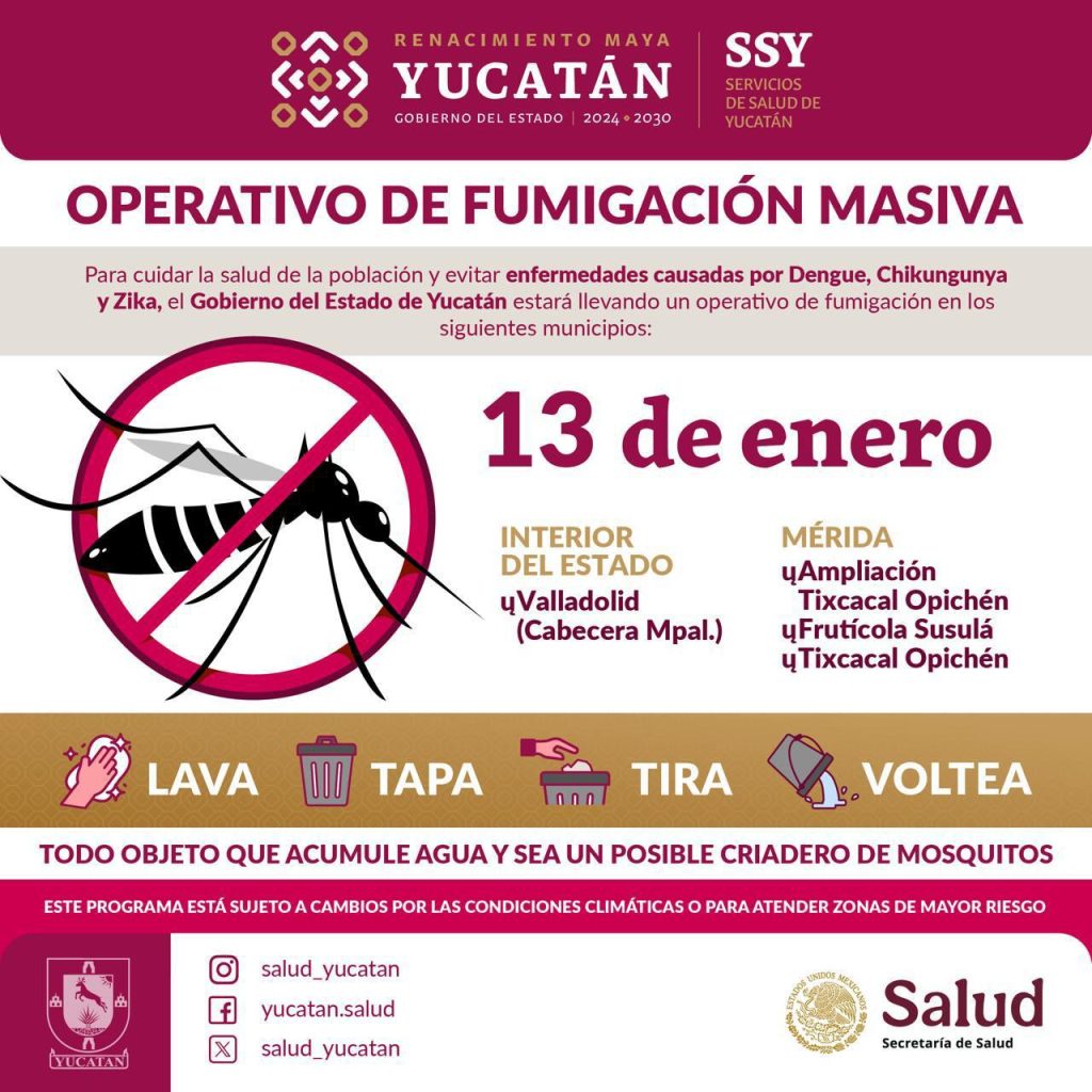 Mérida, Yucatán, a 12 de enero de 2025.- El Gobierno del Estado de Yucatán, encabezado por Joaquín Díaz Mena, dio a conocer las acciones que realiza de forma permanente a través de la Secretaría de Salud de Yucatán (SSY) para combatir el Dengue, Zika y Chikungunya, poniendo a disposición de las y los yucatecos la programación semanal de fumigación en colonias y fraccionamientos de Mérida, así como en municipios del interior del estado.