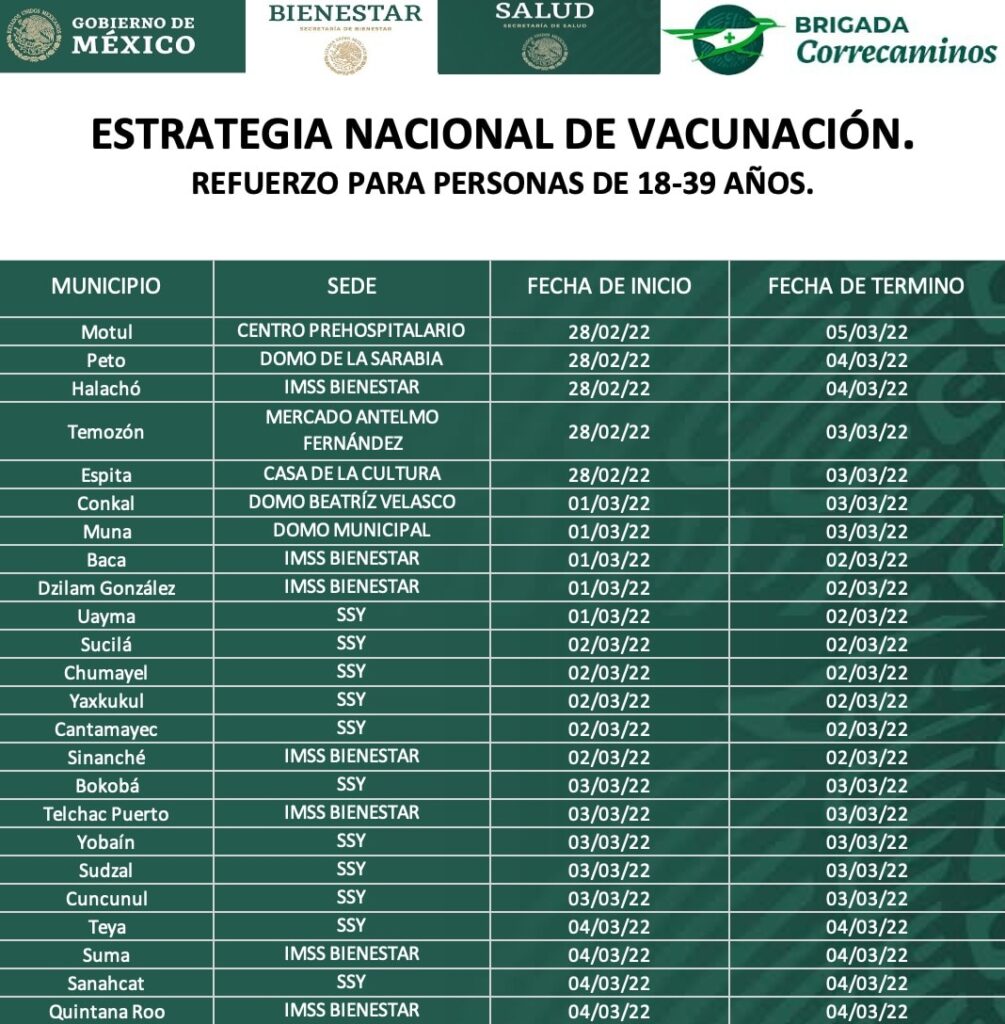 MÉRIDA, Yuc., 23 de febrero 2022.- La Delegación del Bienestar en Yucatán a través del Mtro. Joaquín Díaz Mena, da a conocer el inicio del operativo de la aplicación de refuerzo de vacuna a personas del 18 a 39 años en 24 municipios del interior del estado, será a partir de este 28 de febrero hasta el 05 de marzo del presente año.