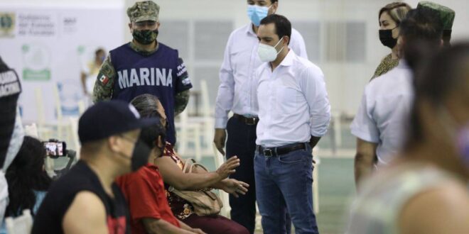 Acompañado del coordinador Estatal para la Vacunación Covid-19, capitán de Corbeta Carlos Gómez Montes de Oca, y del titular de Secretaría de Salud de Yucatán (SSY), Mauricio Sauri Vivas, el Gobernador acudió al macrocentro habilitado en la Unidad Deportiva Kukulcán, donde verificó que el inicio de esta etapa de la vacunación en la capital yucateca transcurra con normalidad, resultado de la coordinación entre el Gobierno del Estado, el Ayuntamiento de Mérida, la Secretaría de Bienestar y las Fuerzas Armadas.