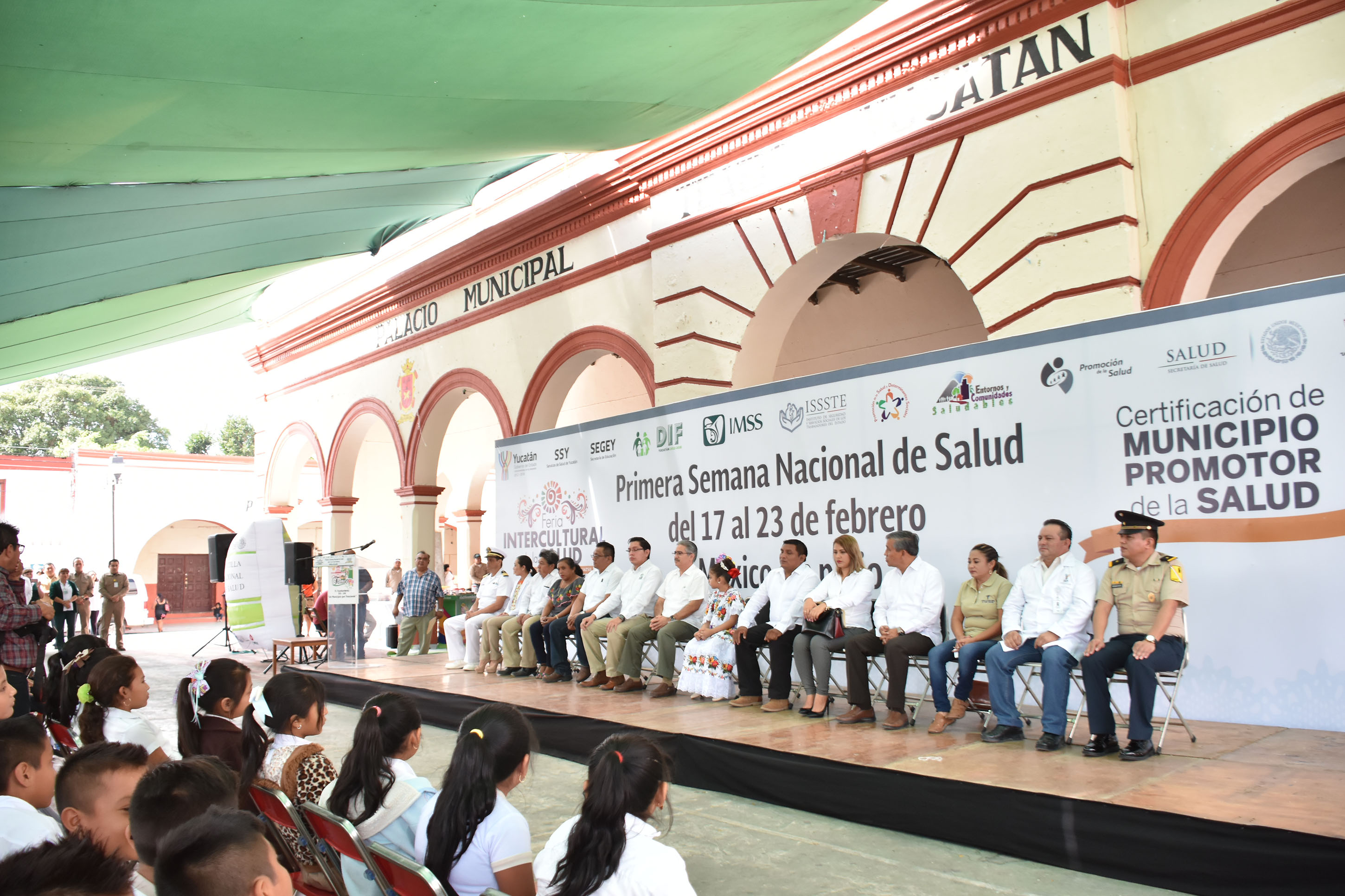 A nombre de los titulares del Ejecutivo y de la SSY, Rolando Zapata Bello y Jorge Eduardo Mendoza Mézquita, respectivamente, el funcionario entregó al alcalde de Teabo, Daniel Fabián Puc Naal, el reconocimiento que certifica a este municipio como promotor de la salud, en el marco del arranque de la Primera Semana Nacional de Salud 2018.