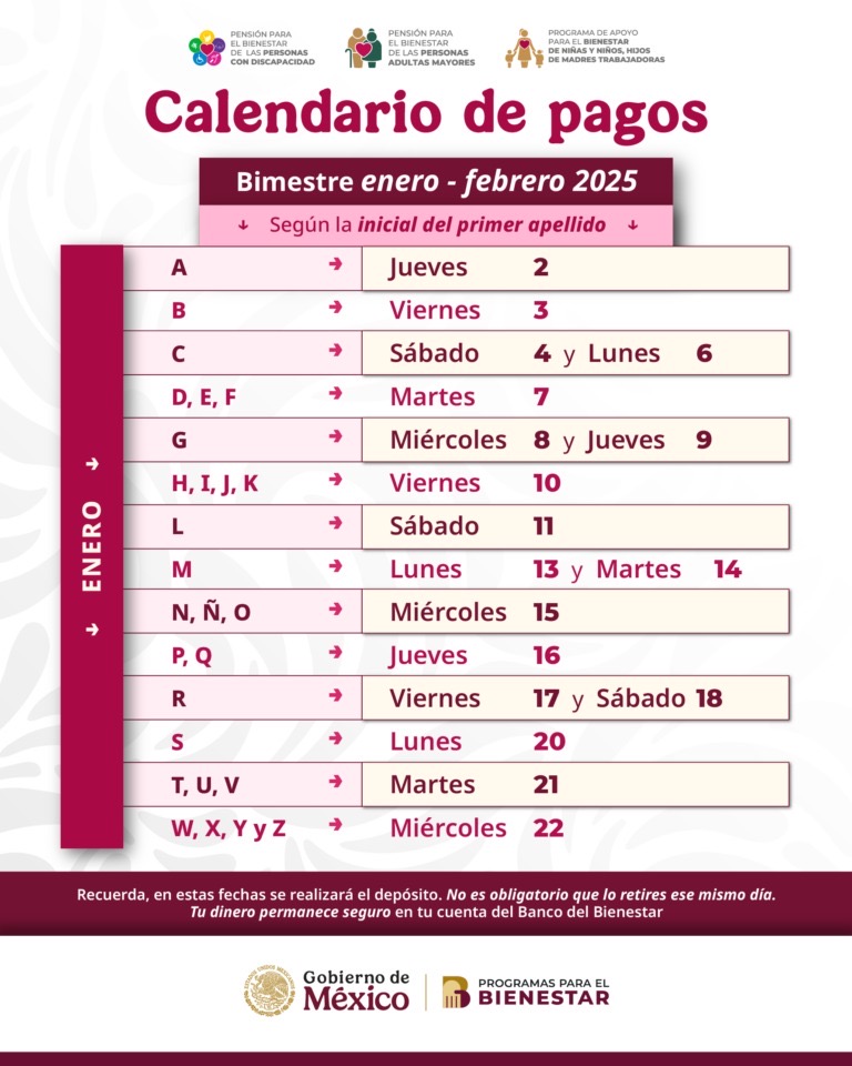 También, recordó que los depósitos de las Pensiones de Adulto Mayor para personas de 65 años y más iniciaron el 2 de enero y continuarán hasta el 22 de enero de acuerdo con un calendario de pagos que está disponible en sus redes sociales y pegado en los Bancos del Bienestar.