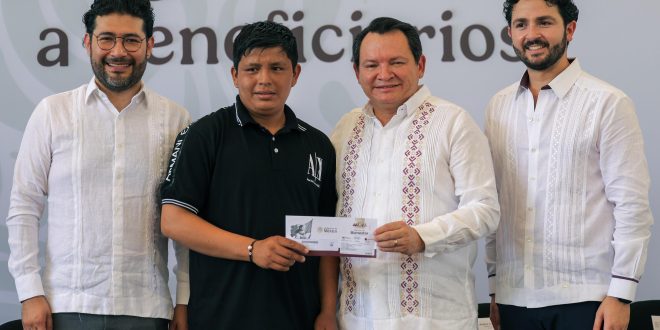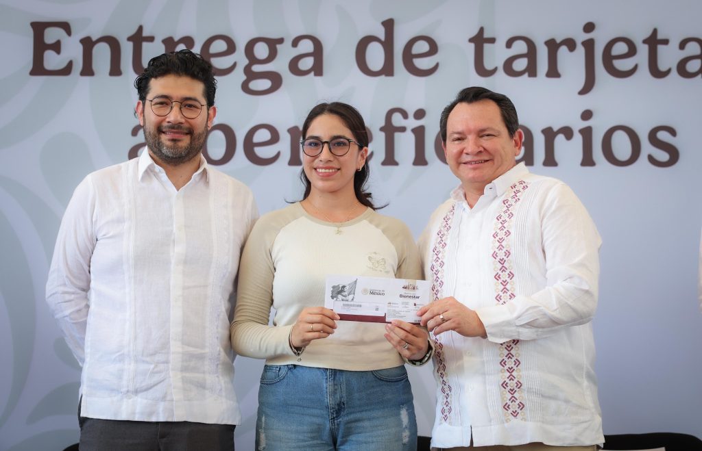 Mérida, Yucatán, a 5 de septiembre de 2025.- Con la entrega de tarjetas del programa federal Jóvenes Construyendo el Futuro, encabezada por el Gobernador Joaquín Díaz Mena y el Secretario del Trabajo y Previsión Social del Gobierno de México, Marath Baruch Bolaños López, inició en Yucatán el proceso mediante el cual las y los beneficiarios recibirán un apoyo mensual de 8,480 pesos durante un año, con el propósito de capacitarse en centros de trabajo y adquirir experiencia laboral que facilite su inserción en el mercado o el emprendimiento de nuevos proyectos.