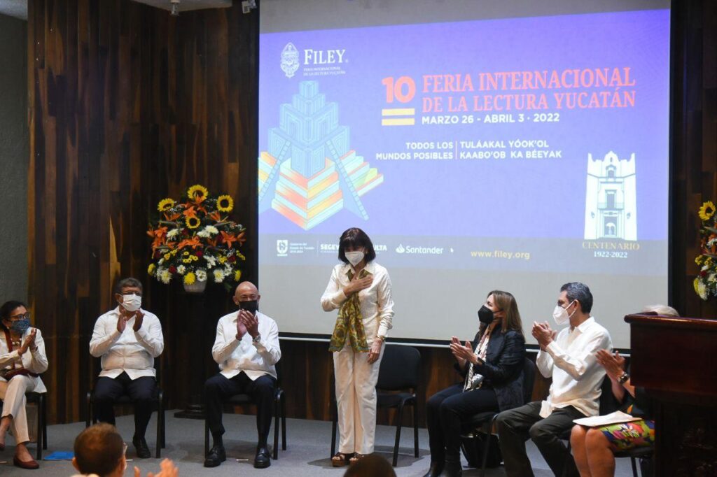 Mérida, Yucatán, 26 de marzo de 2022.- Reconocidos exponentes de las letras, cultura y academia, provenientes de 20 países, participan en la décima edición de la Feria Internacional de la Lectura Yucatán (Filey), que en representación del Gobernador Mauricio Vila Dosal, inauguró la titular de la Secretaría de la Cultura y las Artes (Sedeculta), Loreto Villanueva Trujillo, en ceremonia que enmarcó la entrega del Premio Excelencia en las Letras “José Emilio Pacheco” 2022, a la escritora Rosa Beltrán.