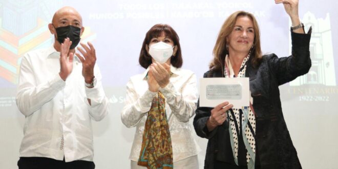 Mérida, Yucatán, 26 de marzo de 2022.- Reconocidos exponentes de las letras, cultura y academia, provenientes de 20 países, participan en la décima edición de la Feria Internacional de la Lectura Yucatán (Filey), que en representación del Gobernador Mauricio Vila Dosal, inauguró la titular de la Secretaría de la Cultura y las Artes (Sedeculta), Loreto Villanueva Trujillo, en ceremonia que enmarcó la entrega del Premio Excelencia en las Letras “José Emilio Pacheco” 2022, a la escritora Rosa Beltrán.