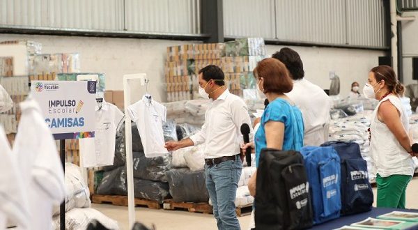 Y para continuar apoyando a la economía de las familias yucatecas impactadas por la inactividad generada por la pandemia del Coronavirus, el Gobernador también verificó los paquetes de uniformes, conformados por 2 camisas, un par de zapatos y una mochila, los cuales acompañarán a los útiles escolares.
