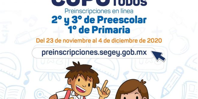 La Secretaría de Educación del Gobierno del Estado (Segey) informa que, a partir de este día, la página www.preinscripciones.segey.gob.mx se encuentra habilitada para realizar el trámite, de forma gratuita, en colegios públicos. De este modo, para segundo y tercer grado de preescolar y primero de primaria, el periodo abarcará del 23 de noviembre al 4 de diciembre, en tanto que para primero de secundaria será del 7 al 18 de diciembre.