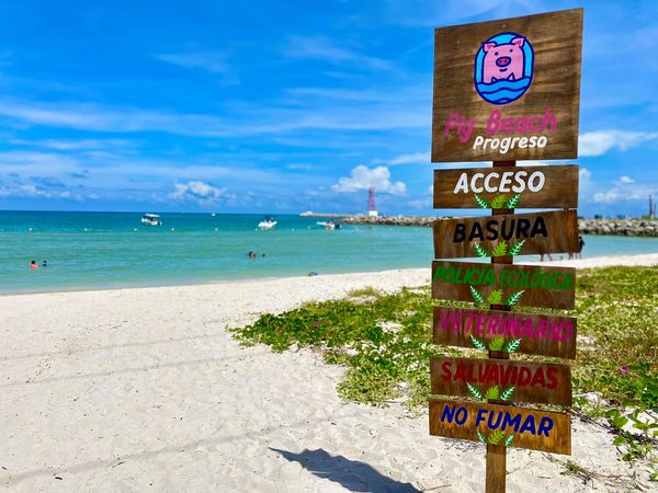 La “Pig Beach”, es un espacio familiar que está ubicado a la entrada de la comisaría de Chelem Puerto, cerca de la Zona Naval con horarios de visita desde las 8:00 am a las 6:00 pm de lunes a domingo, en el que habitan 8 cerdos que fueron rescatados por elementos de la Policía Ecológica, quienes los mantienen bajo resguardo y les brindan atención integral.