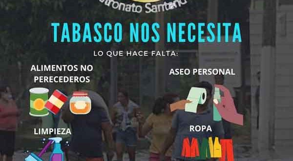 A partir de este domingo 22 y durante una semana hasta el domingo 29 se instalará un centro de acopio de ayuda humanitaria en las instalaciones de la Universidad Santander, con el objetivo de recolectar alimentos y artículos de primera necesidad para enviar a los habitantes de Tabasco que resultaron afectados por las lluvias que se han suscitado por el paso de diversos fenómenos naturales.