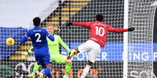 Marcus Rashford adelantó a los visitantes en el minuto 23 al recibir solo en el corazón del área y superar por bajo al meta danés Kasper Schmeichel.