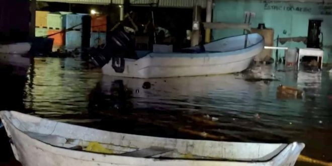 Sisal Yucatán a 07 octubre 2024.- El puerto de Sisal se encuentra en una situación crítica debido a las fuertes inundaciones provocadas por las lluvias intensas que trajo consigo el huracán Miltón. El nivel del agua ha subido considerablemente, afectando las calles del puerto y generando problemas adicionales en la zona.