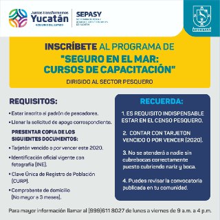 Por lo anterior, Gómez Ortegón explicó que la convocatoria se realizará únicamente el martes 6 de octubre, por lo cual los interesados deberán acudir a las oficinas ubicadas en la calle 19 por 18 y 20 del fraccionamiento Héctor Victoria en un horario de 11:00 de la mañana a las 6:00 de la tarde para quienes pertenecen a la cabecera municipal, mientras que para los pescadores de Chelem, Chuburná y Chicxulub, deberán acudir a sus comisarías en el mismo día y horario.