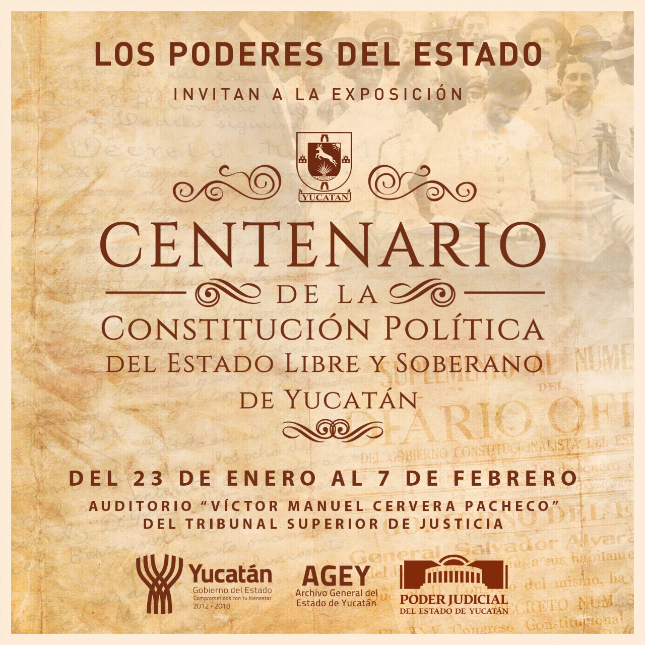 El Poder Judicial del Estado de Yucatán albergará, desde hoy 23 de enero y hasta el 7 de febrero del presente, una serie de importantes documentos históricos, entre ellos los originales de las Constituciones yucatecas de los años 1825, 1841, 1850, 1862 y 1918, como parte de la conmemoración del 100 aniversario de esta última Carta Magna, vigente hasta nuestros días.