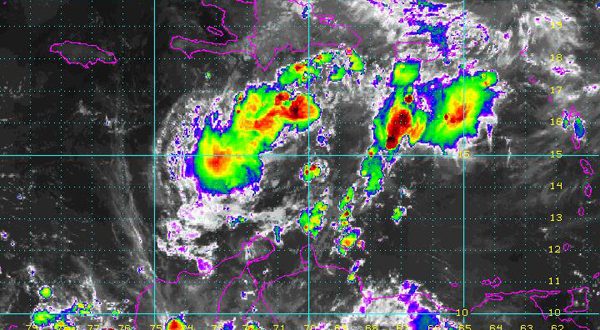Este sistema registra vientos máximos sostenidos de 55 km/h y mantiene su avance hacia el oeste a 26 km/h.
