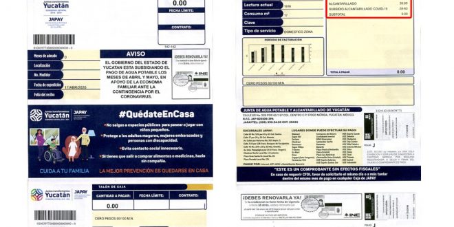 Además, debajo del documento aparece el siguiente aviso: “El Gobierno del Estado de Yucatán está subsidiando el pago de agua potable los meses de abril y mayo, en apoyo de la economía familiar ante la contingencia por el coronavirus”.