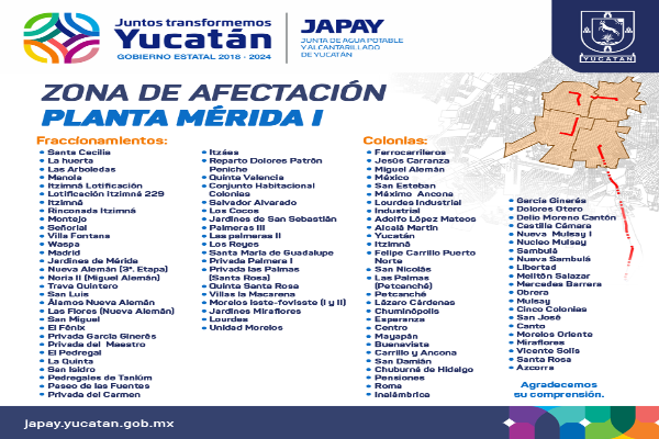 También, destacó la importancia de la Mérida I, que abastece a los cuatro grandes cárcamos de la ciudad, los cuales, a su vez, surten a más de 124 mil predios, y cuya red eléctrica no ha recibido mantenimiento en más de 30 años. Esta planta lleva el 30 por ciento del líquido de la población de la capital, principalmente a las 51 colonias y 51 fraccionamientos ubicados en el sur y Centro, y las que están dentro del Circuito Colonias.