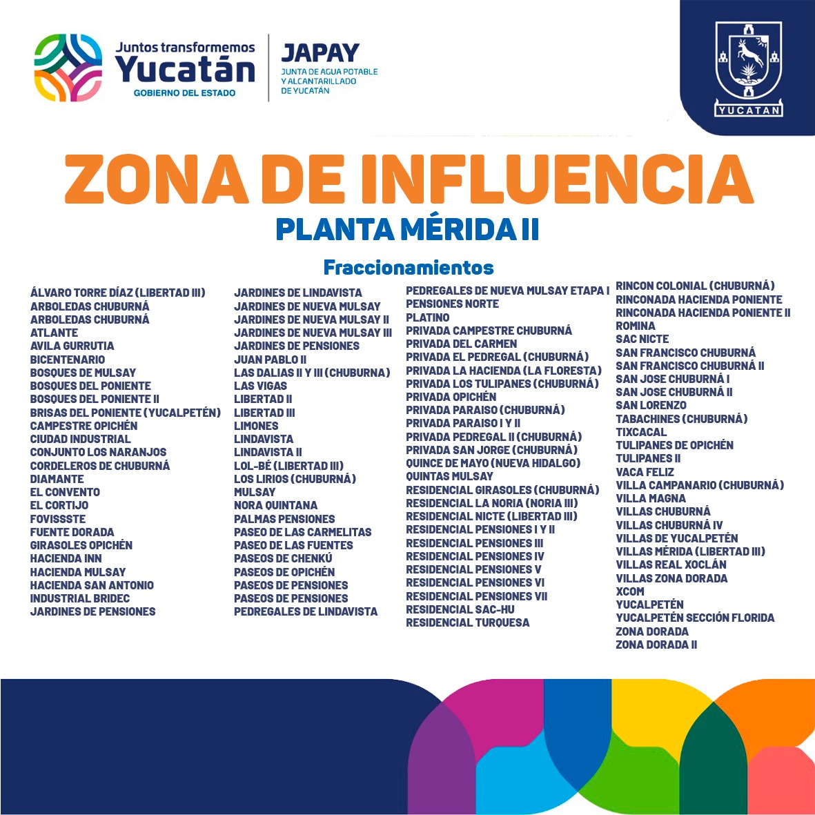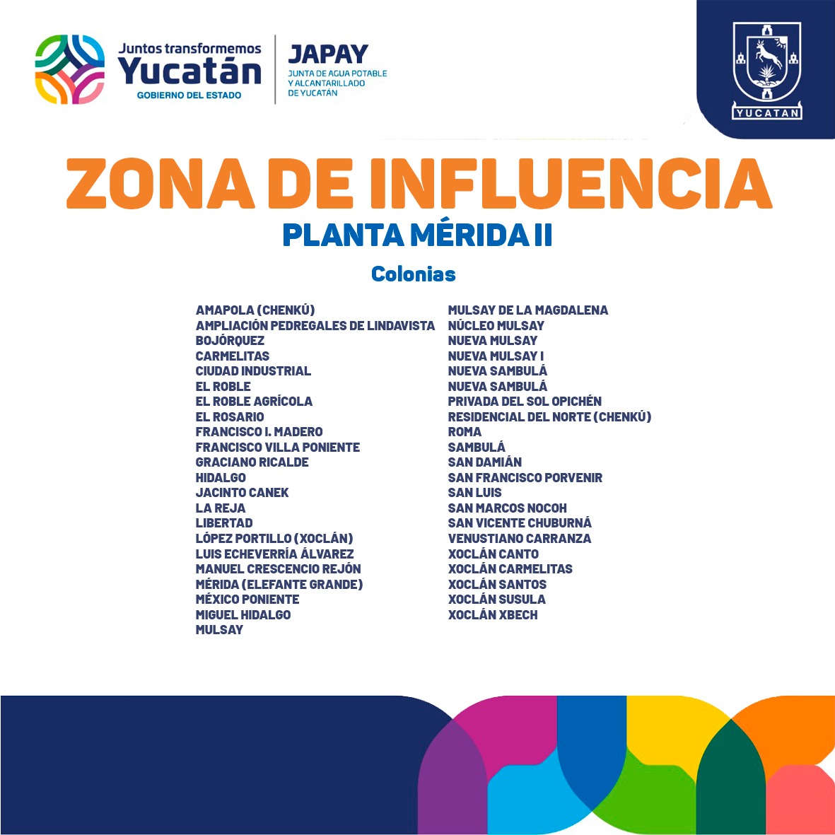 Se afectará las colonias Mérida (Elefante Grande), San Luis, El Rosario, Ampliación Pedregales de Lindavista, Amapola (Chenkú), Francisco Villa Poniente, Bojórquez, Xoclán Carmelitas, Xoclán Canto, La Reja, Ciudad Industrial, Graciano Ricalde, San Damián, Luis Echeverría Álvarez, Roma, Hidalgo, Miguel Hidalgo, San Francisco Porvenir, Jacinto Canek, Carmelitas, Xoclán Santos, El Roble y San Marcos Nocoh.