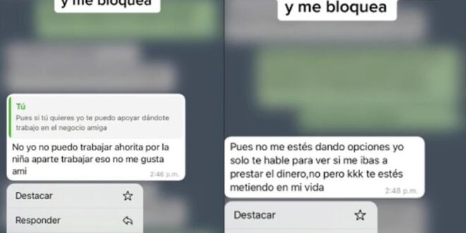 Después de varios mensajes, la amiga se indignó y decidió bloquear de WhatsApp a Emily (no sin antes insultarla y llamarla muerta de hambre), quien posteriormente compartió un video con las capturas de pantalla de la conversación y que fue descrito con la frase: “Póngase a jalar, mija, que el dinero no cae del cielo”.