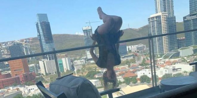 Y es que a través de redes sociales, circula una fotografía en donde se puede ver que la joven practica dicha disciplina de forma extrema, pues está de cabeza y sólo se sujeta con ambos brazos de un barandal al borde de la terraza de la torre de departamentos. Información lopezdoriga.com