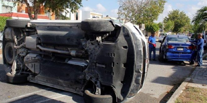 Una mujer en aparente estado de ebriedad volcó con su camioneta luego de chocar con un vehículo estacionado en la avenida 50 del Frac. Francisco de Montejo, ayer a las 8 de la mañana.