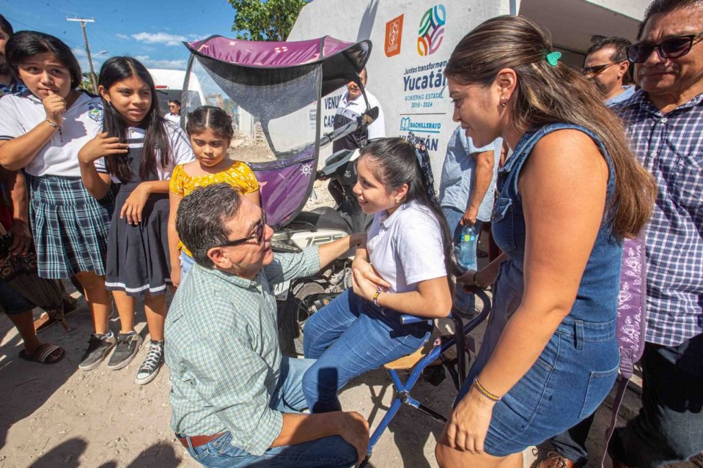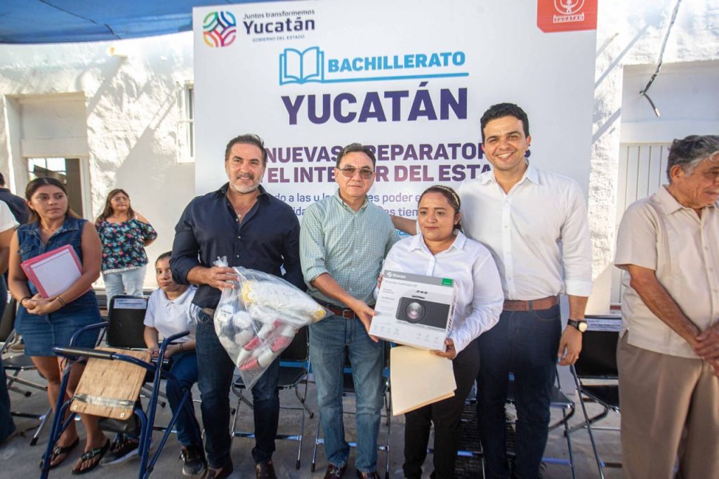 En el marco de la visita se realizó la entrega de un kit deportivo, un proyector multimedia y mobiliario escolar, que será de gran beneficio para la escuela Secundaria y el Bachillerato Yucatán, que funcionan en el mismo espacio escolar, mismo que fue recibido por la coordinadora del plantel, Grissel Pech Muñoz.