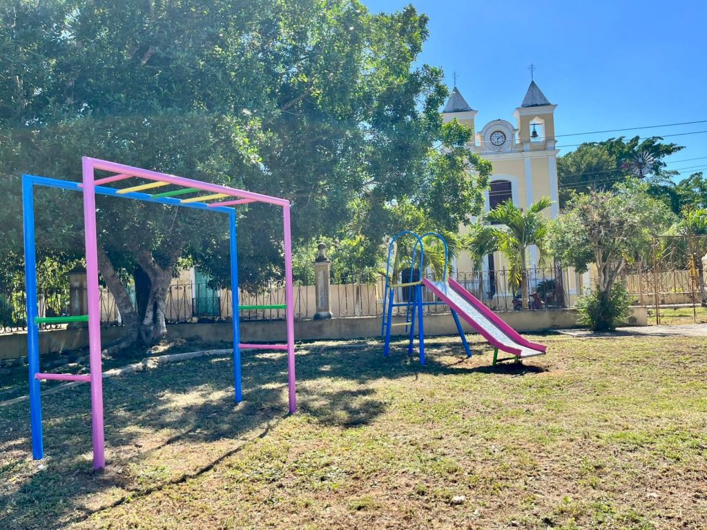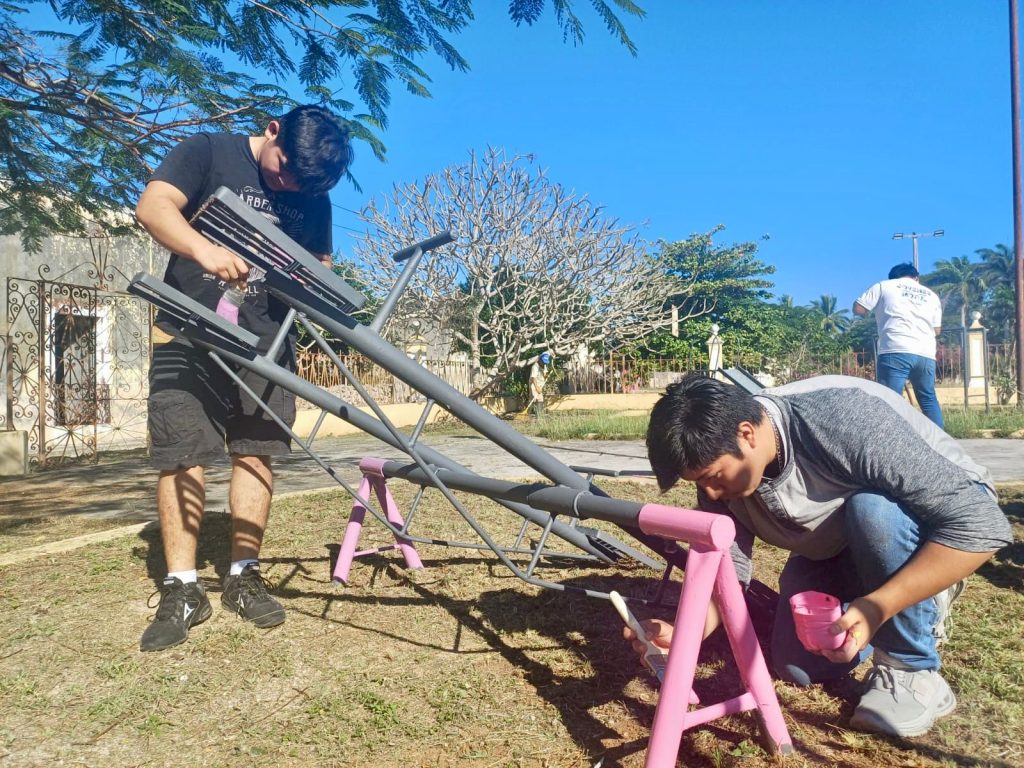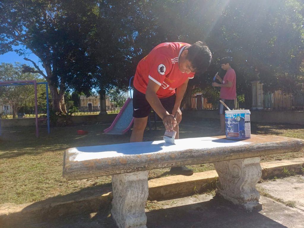 La actividad fue guiada por la síndico municipal, Marisol Tun González, y el encargado del servicio social en el municipio, Ángel Domínguez Nóh. Durante la jornada, los jóvenes se dedicaron al pintado de juegos infantiles y bancas, así como a la limpieza de maleza y basura en los jardines de la comunidad.